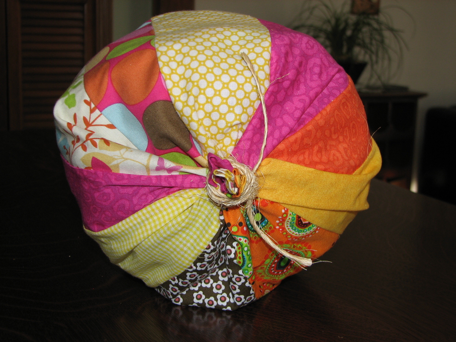 First up, a scrapy little pumpkin. Made with fall colored material scraps and stuffed with old newspaper. It is fun, easy and looks great in any room of your house.